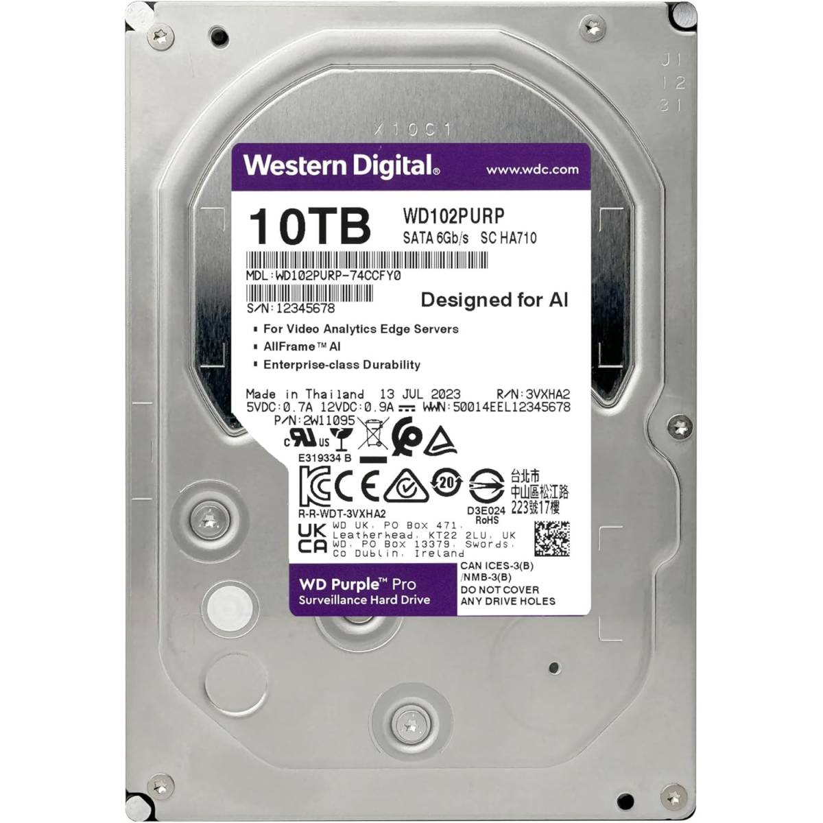 Western Digital WD Purple Pro 10TB Surveillance Hard Drive WD102PURP – 10TB, 7200RPM, SATA 6Gb/s, 512MB Cache, AllFrame AI, 3.5" Internal HDD
