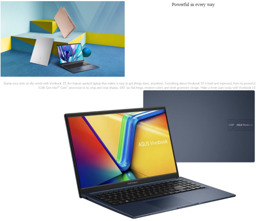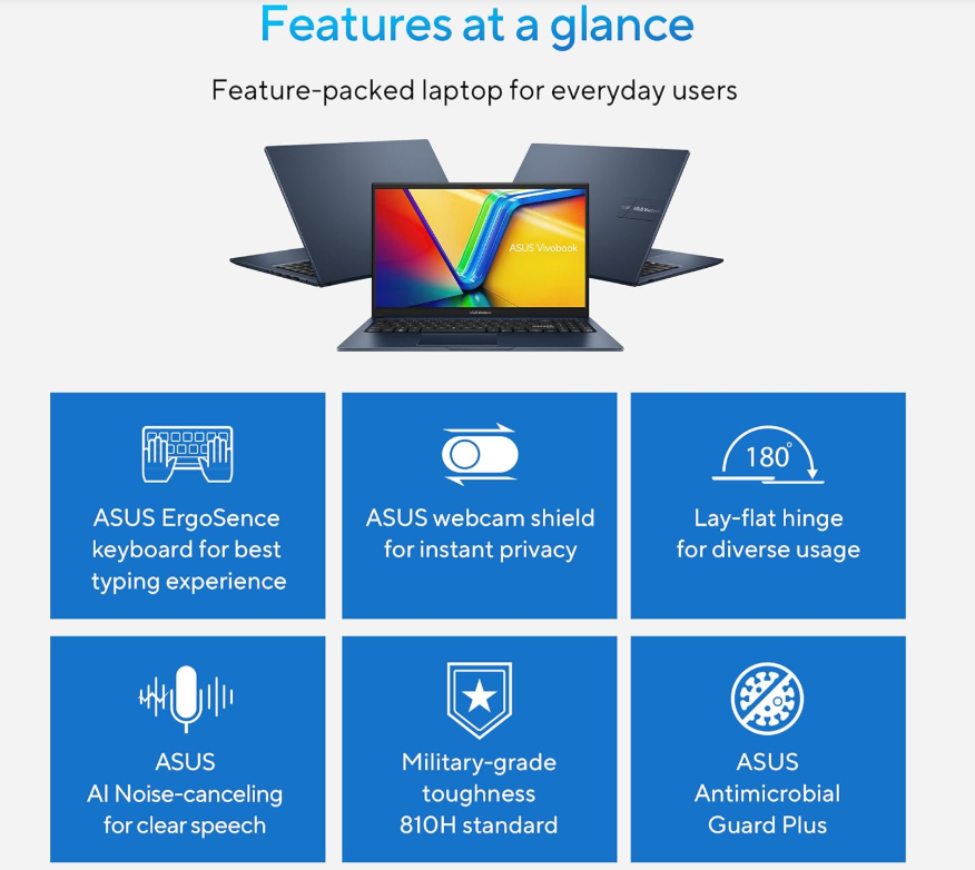 لابتوب ASUS Vivobook 15 X1504VA Laptop مزود بمعالج Intel Core i3-1315U من الجيل الثالث عشر مع 8GB DDR4 RAM وقرص 512GB M.2 SSD ليقدم أداءً سريعًا وموثوقًا للاستخدام اليومي والدراسة والعمل المكتبي.