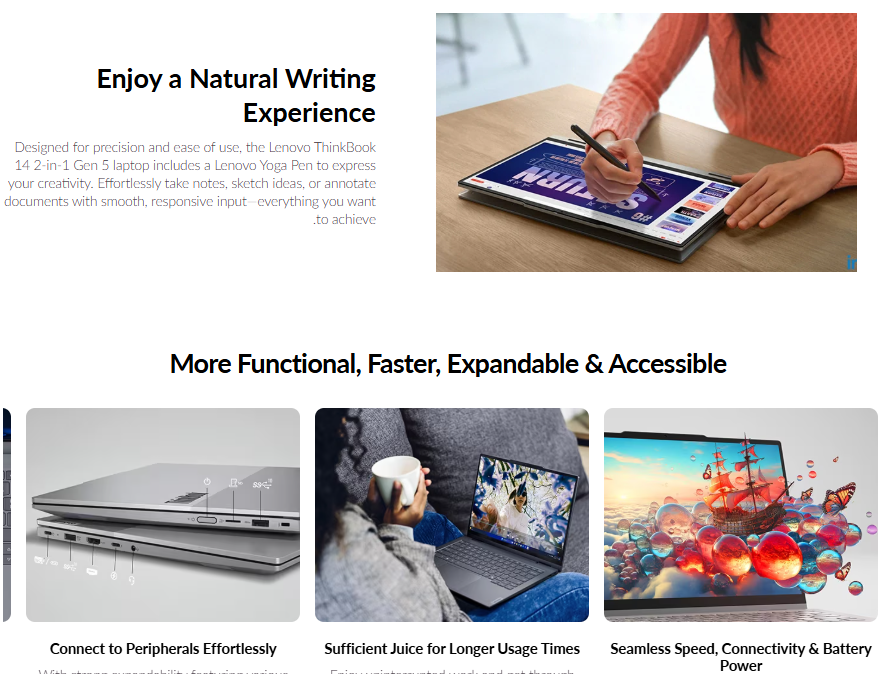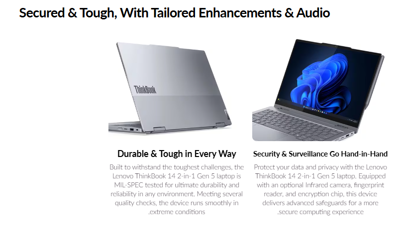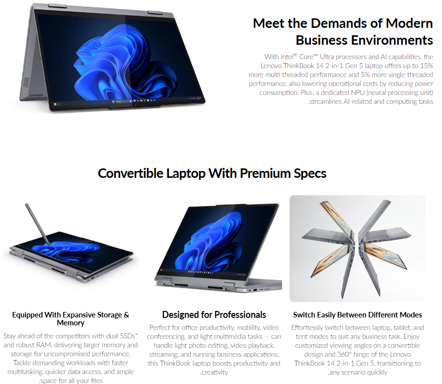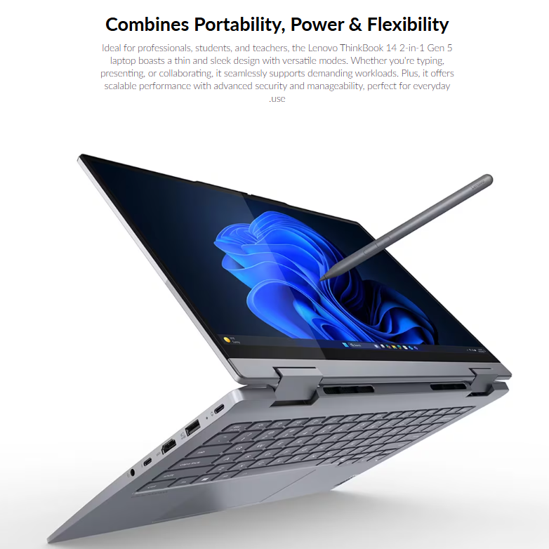يعد Lenovo ThinkBook 14 2‑in‑1 Gen 5 Laptop جهازًا احترافيًا يجمع بين الأداء العالي والمرونة في الاستخدام، حيث يأتي بتصميم 2-in-1 قابل للتحول يمكن استخدامه كلابتوب أو جهاز لوحي.