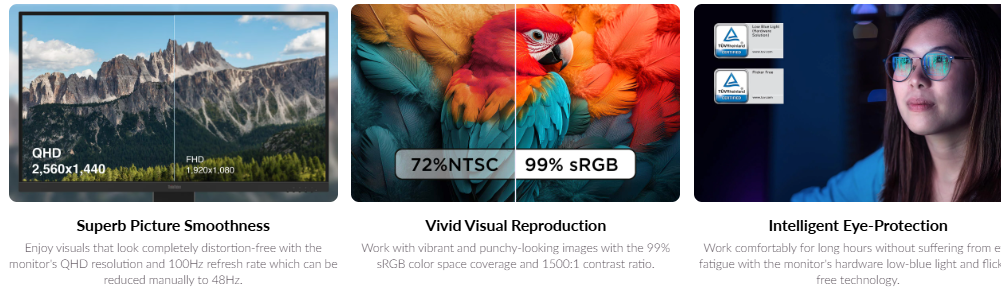 تتميز الشاشة أيضًا بسطوع يصل إلى 350 cd/㎡ مع معدل تحديث 100Hz لتجربة عرض أكثر سلاسة أثناء العمل أو مشاهدة الفيديو.